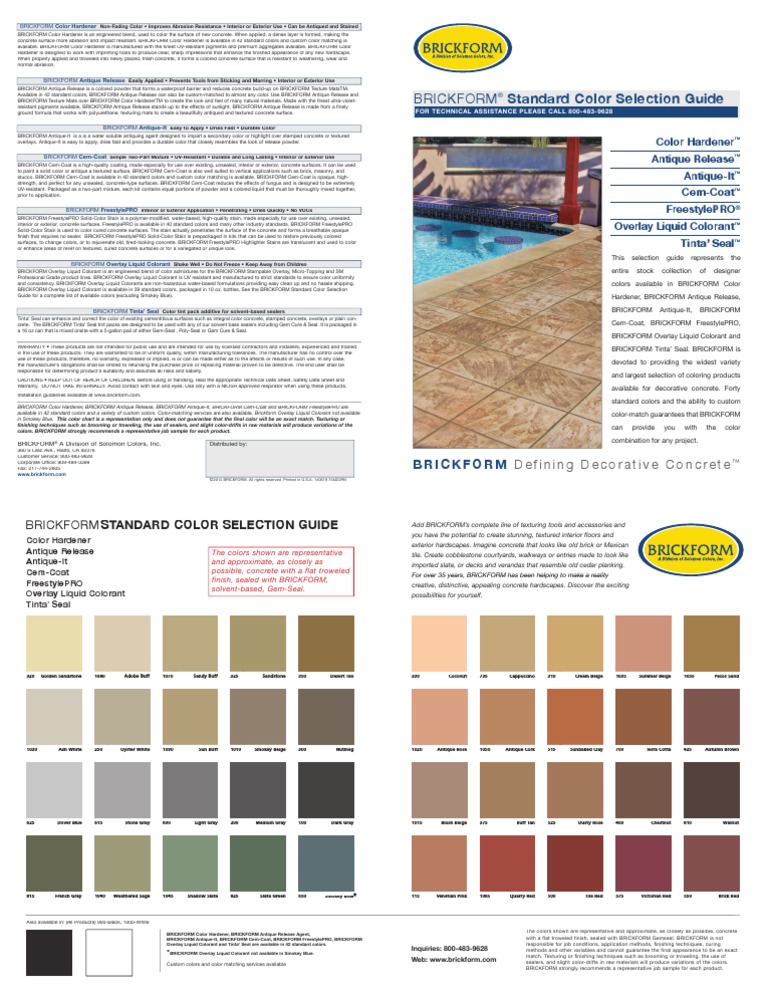 Integral ColorTo produce permanent color that penetrates the entire slab and wont wear away or fade after time you can add integral coloring pigments to the fresh concrete at the batch plant or the jobsite. Color Card - Brickform Standard Color Selection Guide. BRICKFORM Overlay Liquid Colorant not available in NEW colors Smokey Blue or White.